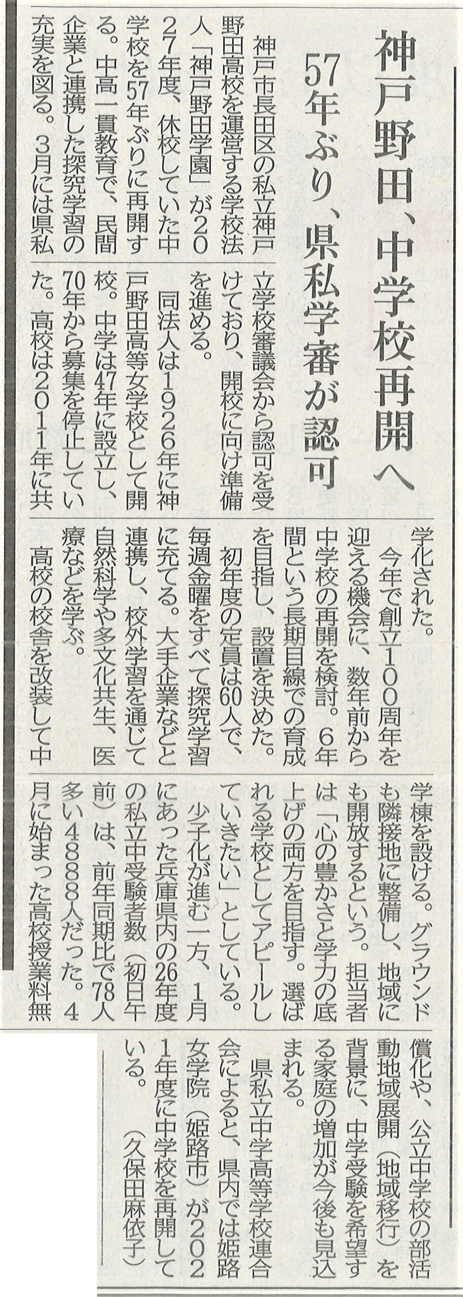 神戸新聞(4/18朝刊)に神戸野田中学校の記事を掲載していただきました。