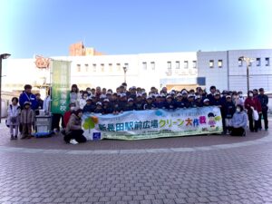 2025年12月6日(土)、今年最後の「新長田駅前広場クリーン大作戦」が行われ、本校から吹奏楽部、インターアクト部、尾﨑校長を初め教員2名が参加しました。そして今月は年末の大掃除を兼ねた大規模な清掃活動として、地域からは長田区連合婦人会、新長田合同庁舎、長田区役所等の各関係機関、神戸市議会議員、少年野球チーム、企業の皆さまとともに、1年間の感謝の気持ちを込めた特別な清掃活動となりました。