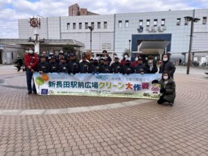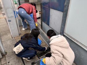 当日は前夜から厳しい冷え込みとなり、気温3℃の中での活動となりました。地域から集まった参加者の皆さまとともに、新長田駅前周辺の歩道や植え込みを中心に清掃を行い、駅前の環境美化に取り組みました。