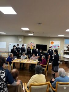 今年度初めてスタートした選択授業“地域×スポーツ”で、受講生35名が様々な企画運営、実習を通して一回り成長することができました。1学期には、J3リ―グに属するFC大阪チームの集客のために、[スタジアムグルメ]の企画を考え、実際に出店しました。2学期には命の重みを考えるテーマから、いざという時の心肺蘇生術を体験し、神戸市民救命士の資格取得に取り組みました。また、献血センタ―から講師の方にお越しいただき、献血の必要性、若者の献血離れなどの講義を受け、献血者を増やすための取り組みを考えました。また3学期に行う福祉体験実習のために高齢者体験を行い、視覚・聴覚の老化現象などの体験をすることで、どのような配慮が必要かを考えることができました。3学期は、ユニバーサルデザインを学び、実際に車椅子で生活されている方との交流から、私達ができること、しなくてはならないことなどを考えるきっかけができました。この授業のまとめとして最終日に長田区にある高齢者施設4カ所に分かれ、グループで考えてきた“心・身”、“体・頭”に働きかけるプログラムを実際に行いました。利用者の皆さんとともに交流しながら、各グループの出し物や体操、ゲームなどで楽しんで頂きました。